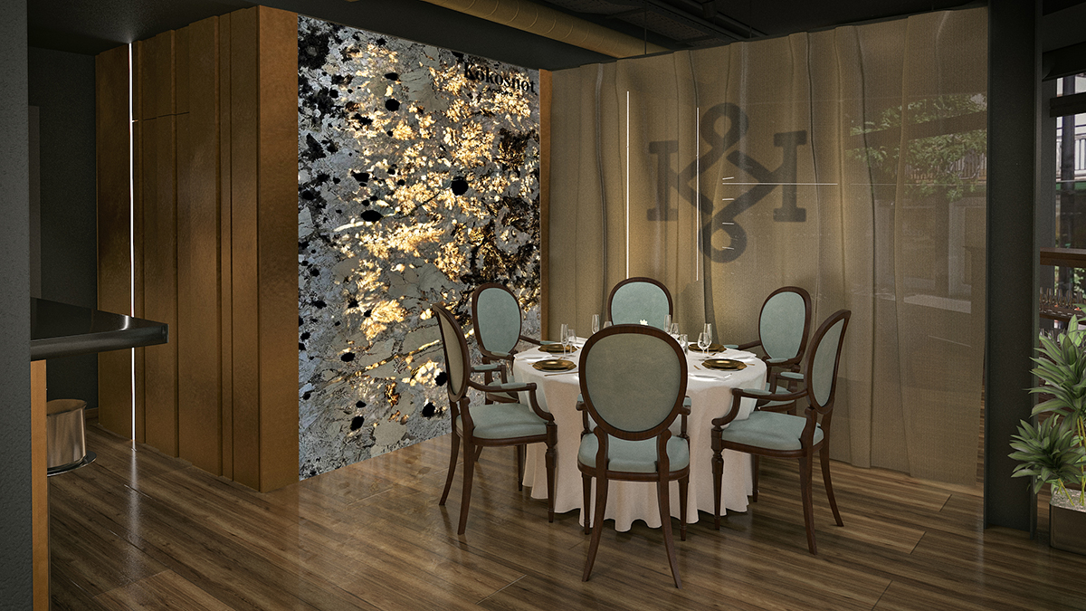 Presidiendo el panelado, como «cabecera» de un reservado, se ha planteado una gran pieza de piedra natural (Alpinus Polished) de 2.60m de altura, que por su morfología se puede retroiluminar.